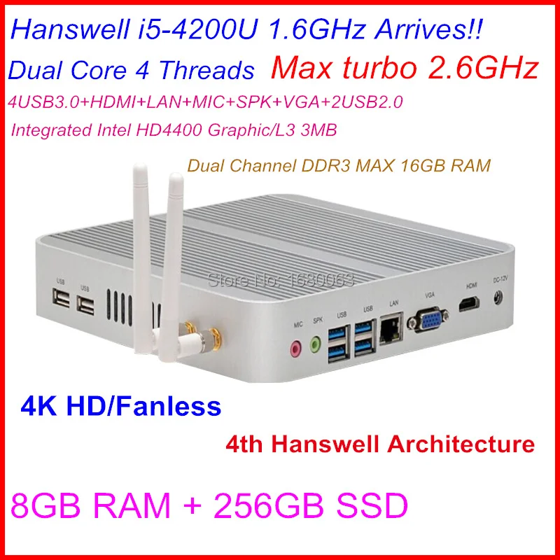 Main Features : Fanless 4K mini pc I5 4200u with Intel Core i5 4200U 1.6Ghz CPU Haswell Architecture SOC design 8G RAM 256G SSD windows Linux