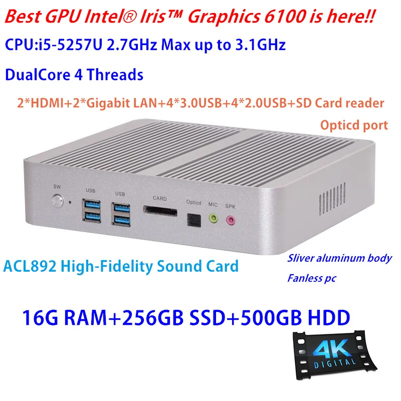 Main Features : Top GPU Iris HD 6100 Broadwell Intel Core i5-5257u Fanless Gaming Mini PC with 16GB RAM+256GB SSD+500G HDD HTPC Hi-Fi Sound Card