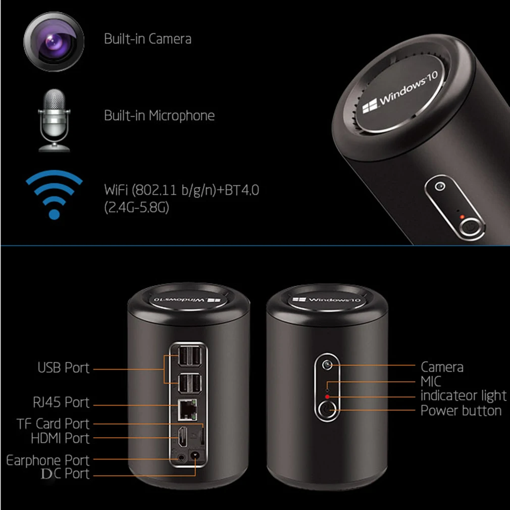 Main Features : Windows 10 Wifi Mini PC Host 32G Memory Bay Trail CR 2.4G WIFI with Built-in MIC Camera Main Host EU Plug Black Wholesale